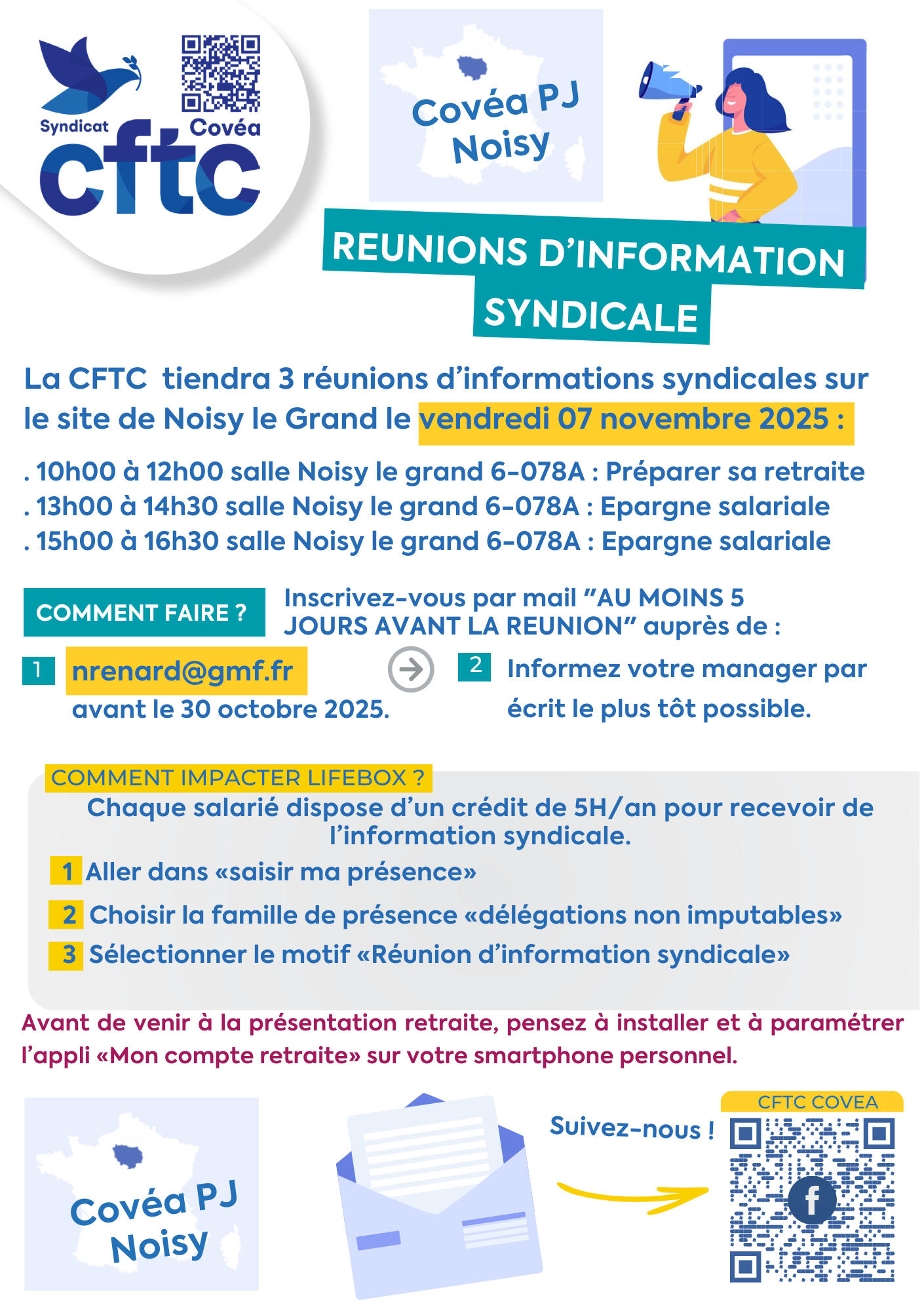 07 novembre 2025 : réunions d’info CFTC à Covéa PJ Noisy – Retraite & épargne salariale
