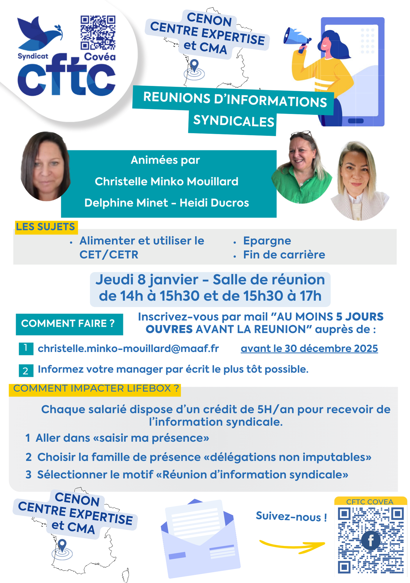 | 08-janv. | MAAF CENON CMA & CE | 15h30 => 17h00 | Alimenter CET/CETR – Epargne – Fin de carrière | Christelle Minko Mouillard ; Delphine Minet ; Heidi Ducros | S’inscrire ICI | |