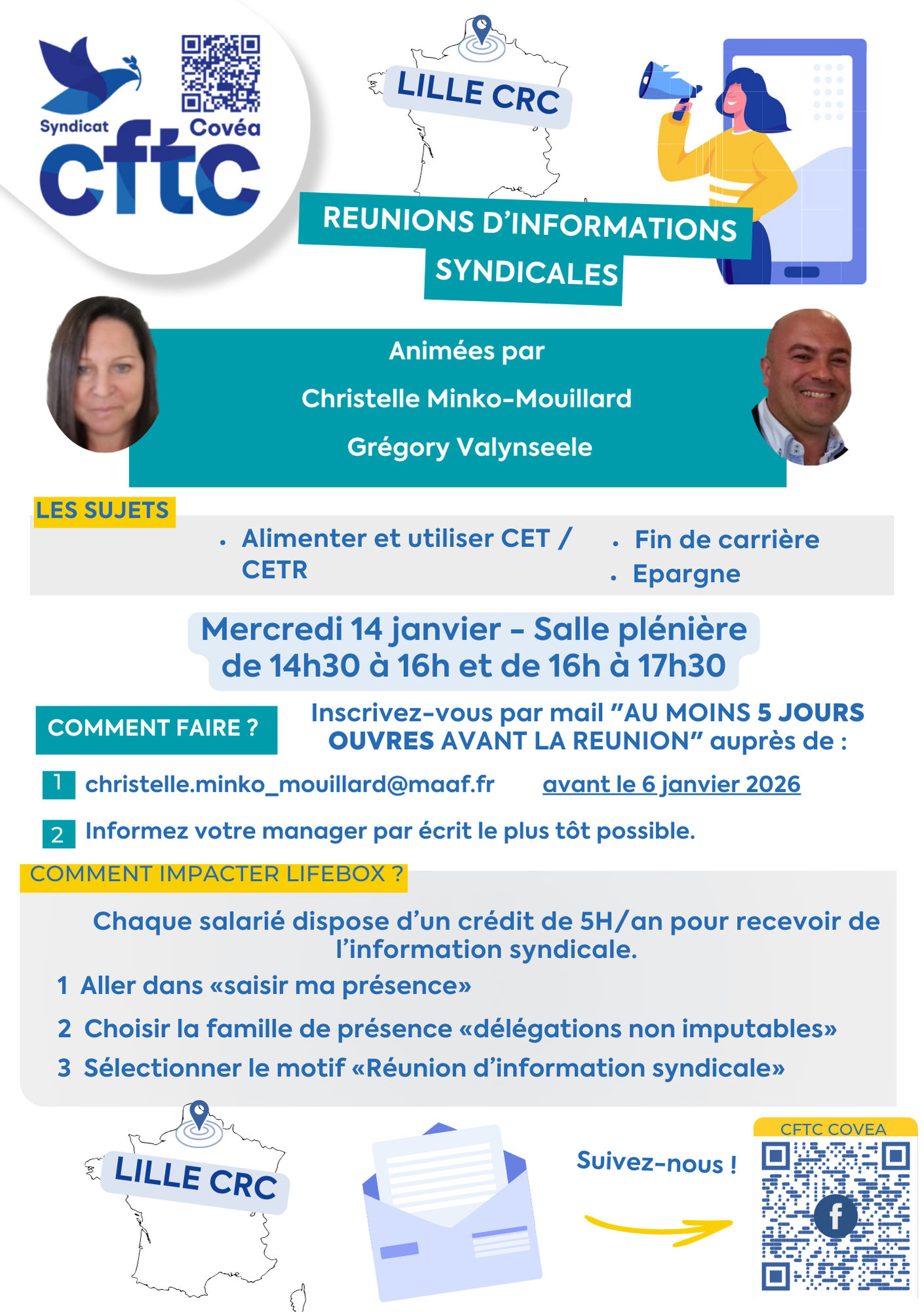 | 14-janv. | MAAF LILLE CRC | 16h => 17h30 | Alimenter CET/CETR – Epargne – Fin de carrière | Salle plénière | Christelle Minko Mouillard ; Grégory Valynseele | S’inscrire ICI |
