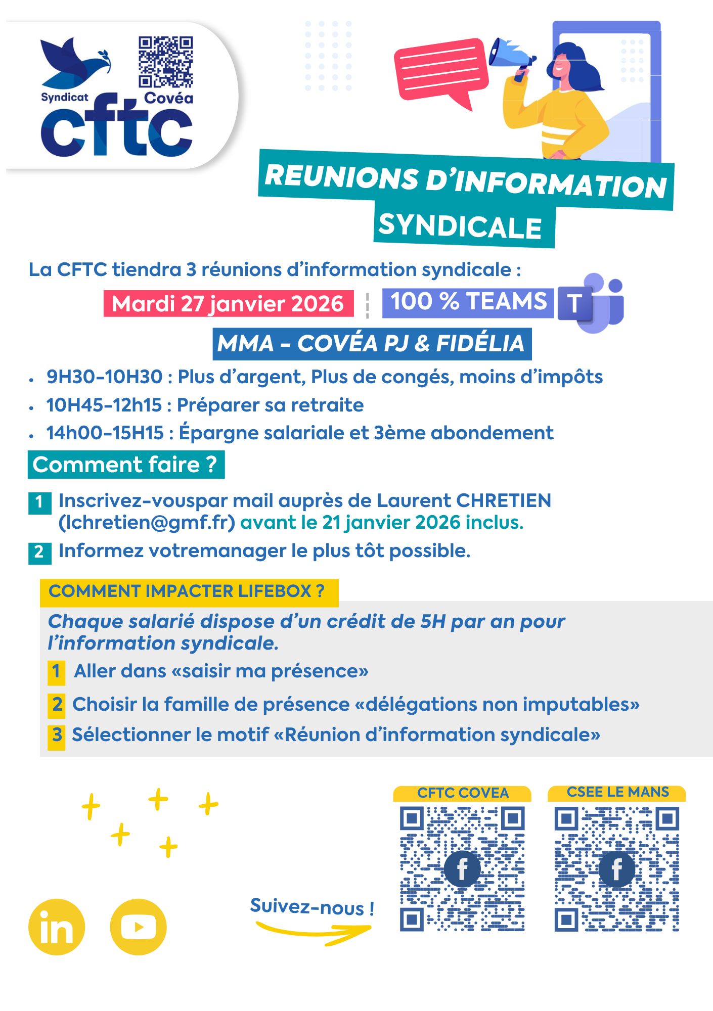 | 27-janv. | Teams MMA FIDELIA COVEA PJ | 09h30 => 10h30 | Plus de sous, plus de congés, moins d’impôts. | Laurent CHRETIEN | S’inscrire ICI | |