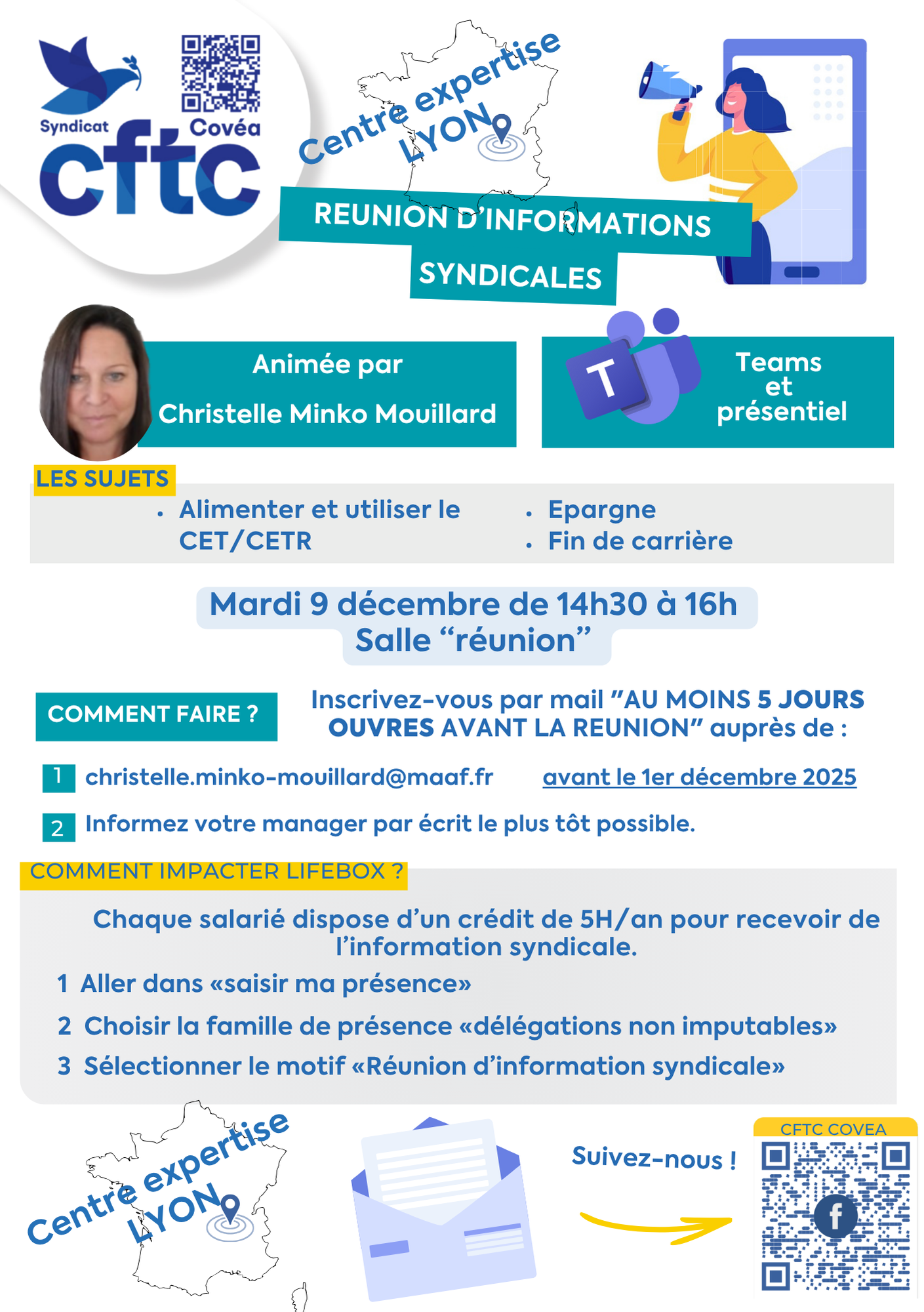 LYON Centre d’Expertise – réunion d’info CFTC – 9 décembre 2025 Téléchargez le flyer en cliquant dessus : CENTRE EXPERTISE LYON 9 DECEMBRE 2025 Livret CFTC – Connaitre ses droits – Juillet 2025 Livret CFTC – Epargne salariale – Juillet 2025 PAGE GARDE – LIVRET SANTE – TOME 1 LES EVENEMENTS DE LA VIE Livret CFTC – Retraite – Jan 2025 Livret CFTC – Le 3eme abondement – Jan 2025 L’équipe CFTC COVEA reste à votre disposition. Je partage cette info sur les réseaux sociaux