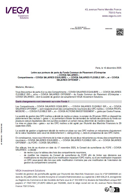 Il s’agit d’une information destinée aux porteurs de parts (vous) pour vous prévenir de changements dans la gestion des fonds où vous avez investi via votre PEG. Ces fonds sont des compartiments nourriciers (ils répliquent la performance d’un fonds maître géré par Covéa Finance).