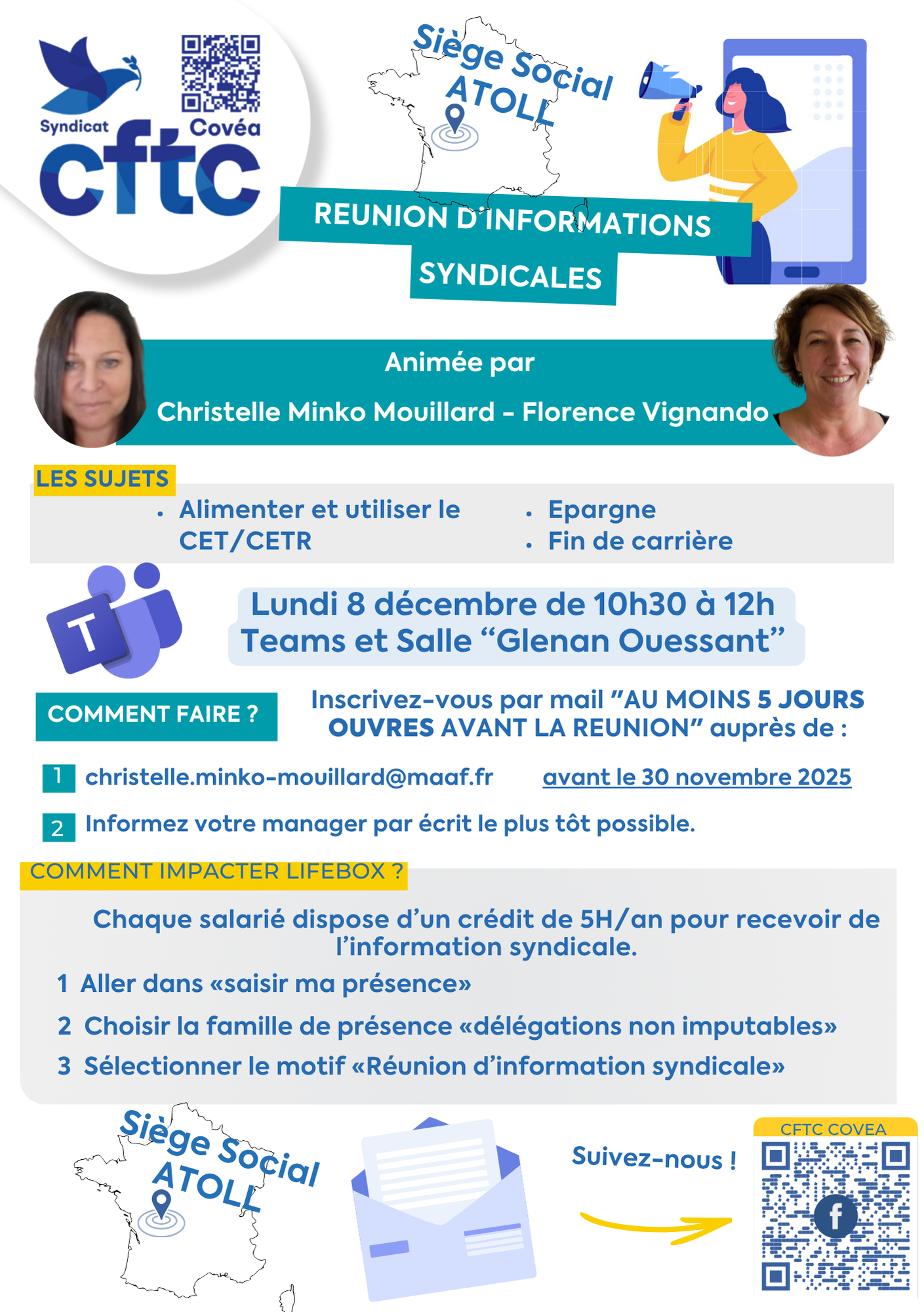 Siège Niort ATOLL – réunion d’info CFTC – 8 décembre 2025 Téléchargez le flyer en cliquant dessus : ATOLL 8 DECEMBRE 2025 Livret CFTC – Connaitre ses droits – Juillet 2025 Livret CFTC – Epargne salariale – Juillet 2025 PAGE GARDE – LIVRET SANTE – TOME 1 LES EVENEMENTS DE LA VIE Livret CFTC – Retraite – Jan 2025 Livret CFTC – Le 3eme abondement – Jan 2025 L’équipe CFTC COVEA reste à votre disposition. Je partage cette info sur les réseaux sociaux